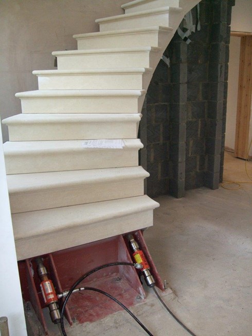 "RB10T roof bolting jacks used to tension a staircase in a house in Kingston upon Thames." 13mm post tensioning strand tensioned to 80KN each. Click to view larger image